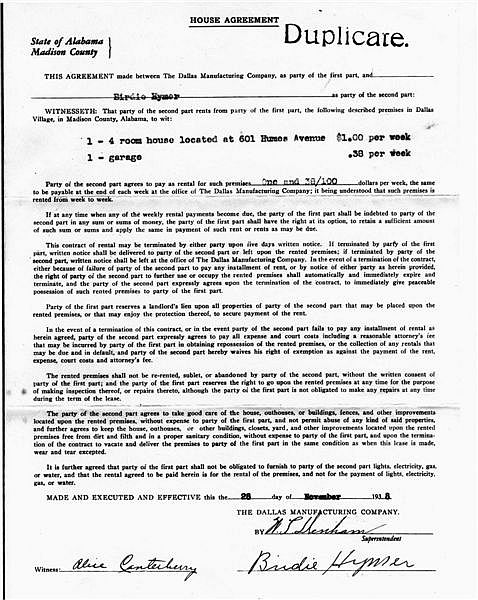 He developed a headache and told his supervisor (who was his brother, Clarence) what had happened and Clarence told him to go home. When he went to the doctor the next day because of the severe headache, the doctor said he had a blood clot on his brain. From that time on he suffered severe headaches and had two operations to remove pieces of his skull to relieve pressure on his brain. He died on March 3, 1929, at Huntsville Hospital after the second operation; he was 19 years old; I was 5 1/2 months old. I would like to know if anyone else died due to an accident in the mill. The mill set up a trust fund for me at Rison Bank, the money from which could be used for my benefit with approval of the bank trustees. I don't know but I believe it was used for extraordinary expenses like doctor, dentist, etc. Also, when Rison School was operating on a 7 month school year, one could pay and go the additional 2 months and so I attended for the full 9 months made possible by the trust. When I graduated from high school there was enough money to pay my tuition for a course at the Nashville Business College in Nashville, TN. I don't know the original value of the trust fund but even a little money was a lot during that time.