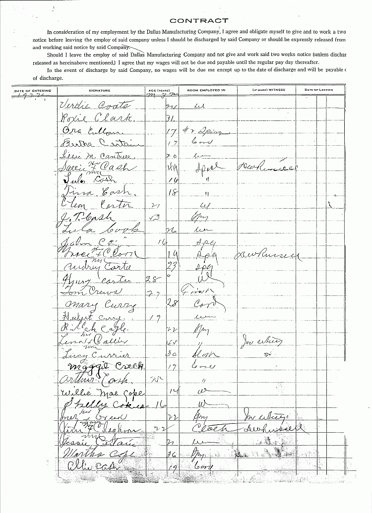 In October 1928, my dad, Lionel Certain, who had gone to work at Dallas Mill, was walking down an aisle in the mill when a bobbin fell from a top rack and hit him on his forehead at his hairline; it did not break the skin.