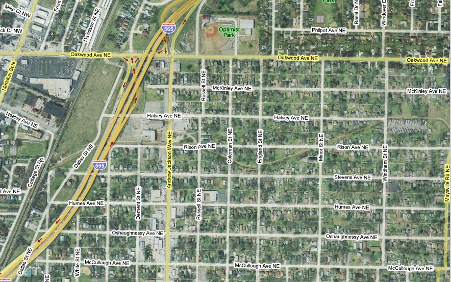 Circa 1990 - The picture below was taken from Oakwood Avenue and shows pillars constructed to support a portion of I-565; note Dallas Mill in the background.